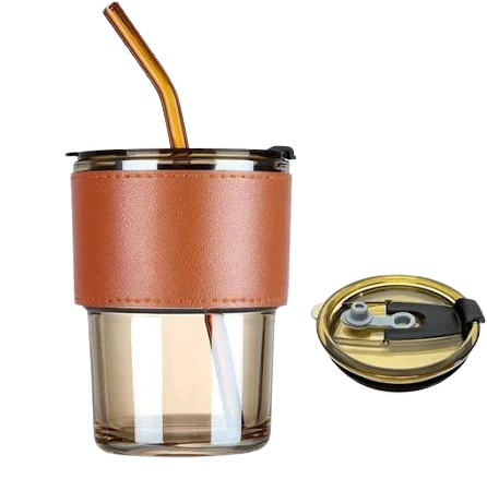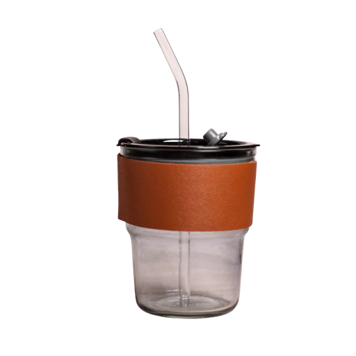 Glass Mug Sipper Tumbler with Lid, Straw & Anti-Slip Leather Sleeve 435ML